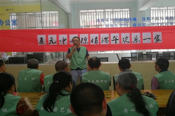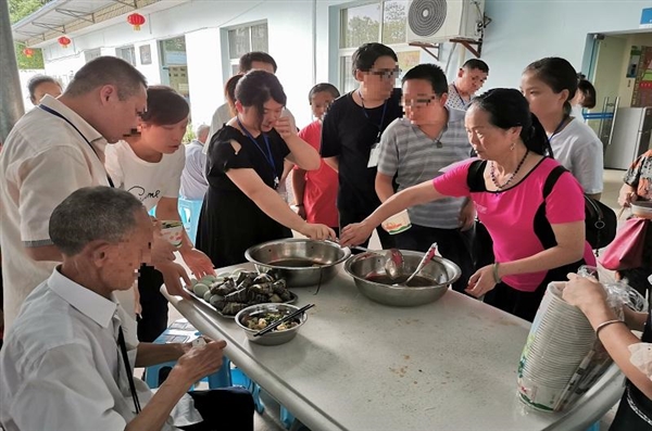 2019年6月6日上午,自贡市精神、老年康复科组织老年三级康复病员和心灵阳光康复会所会员,将近60人庆祝中国传统节日端午节。洞桥社区爱心服务队的志愿者阿姨们也参与其中,工作人员与会员们一起包抄手、煮稀饭。另外,为患者提供了粽子、咸鸭蛋,让患者在住院期间感受如家般的温暖。
