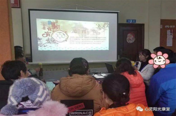 上午10:30,心灵阳光康复会所的职员与会员庆贺元宵节。会员彭某与职员首先为大家分享元宵节的由来,然后会员们积极地涌向了灯谜区。灯谜区挂满了各种灯谜。“猜灯谜”又叫“打等谜,是我国独有的富有民族风格的一种文娱活动形式,是从古代就开始流传的元宵节特色活动,人们把谜语写在字条上,贴在五光十色的彩灯上供人猜。因为谜语能启迪智慧又迎合节日气氛,所以响应的人很多,而后猜谜逐渐成为元宵节不可缺少的节目。38个灯谜不到20分钟都被猜完,猜中者还有小礼品。11点半左右,会所全体成员一起享用汤圆庆贺新年。