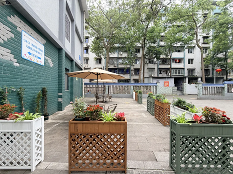 该休憩角以“自然疗愈”为设计理念,布局温馨而雅致。错落有致的木质花箱环绕四周,绿植花卉生机盎然,为静谧的庭院注入了蓬勃活力。遮阳伞下,整齐摆放的圆桌与座椅,成为患者与家属闲暇时围坐闲谈、沐浴阳光的理想场所。
