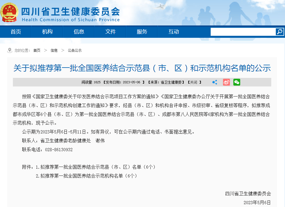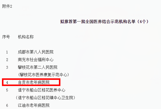 近日,四川省卫生健康委发布了关于拟推荐第一批全国医养结合示范县(市、区)和示范机构名单的公示,其中,我院(自贡市老年病医院)被列入第一批全国医养结合示范机构拟推荐名单。