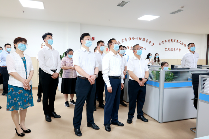 在自贡市社会心理服务平台调度指挥中心,徐斌书记详细了解了平台筛查干预机制、数据采集共享、服务模式等运行情况,以及自贡市全国社会心理服务体系建设试点工作开展情况,建议要进一步加强平台建设,丰富优化心理危机干预演示形式,为群众提供更优质高效的社会心理服务。
