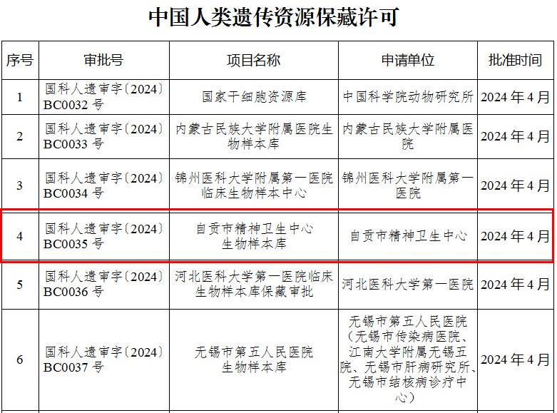 近日,科技部公布了中国人类遗传资源行政许可事项2024年第7批审批结果,其中,我院生物样本库获批“中国人类遗传资源保藏审批”许可(国科人遗审字〔2024〕BC0035号),是自贡市首家获此许可的医疗机构。