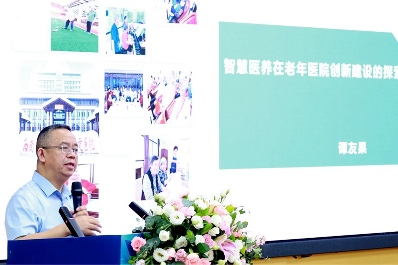 值得一提的是,在这场学术盛会中,我院党委书记谭友果以《智慧医养在老年医院创新建设的探索》为题开展专题报告,介绍了四川省、自贡市老龄化趋势,以及国家相关政策和当前面临的挑战,并重点从智慧医养服务平台和智慧病房建设、老年医教康护养产人工智能战略、智慧医疗设备设施应用等方面,就医院推进智慧医养、智能康复相关工作的经验、举措及成效进行了分享,获得了与会领导嘉宾的好评。