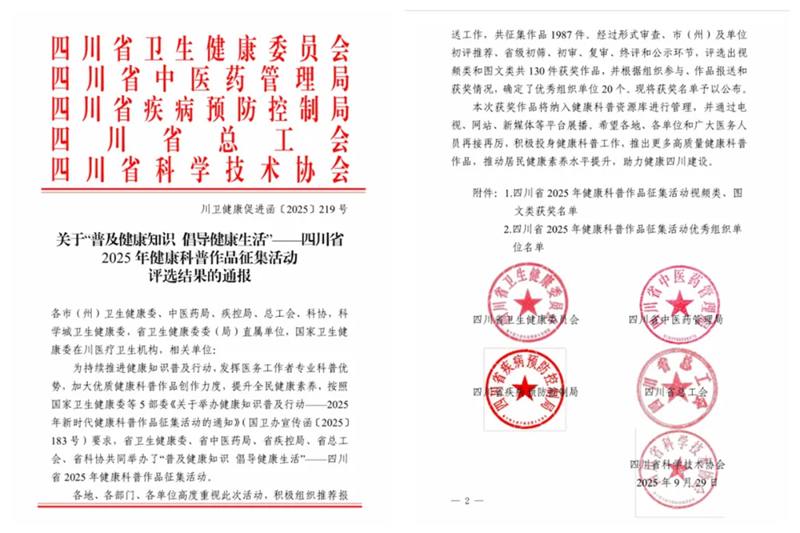 本次活动由四川省卫生健康委员会、四川省中医药管理局、四川省疾病预防控制局、四川省总工会、四川省科学技术协会共同举办,共设优秀奖、入围奖、优秀组织单位三个奖项,旨在持续推进健康知识普及行动,发挥医务工作者专业科普优势,加大优质健康科普作品创作力度,提升全民健康素养。
