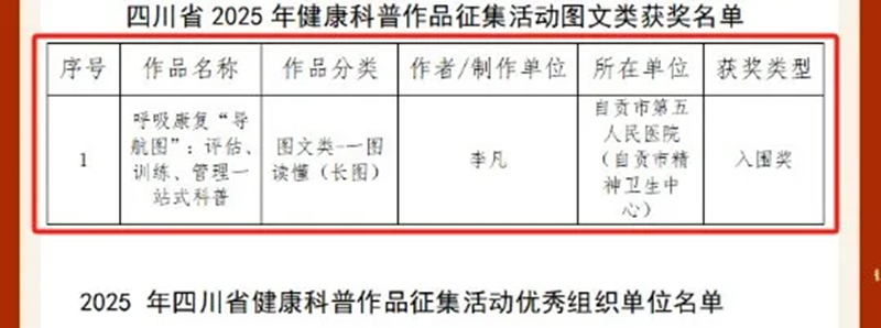 近日,四川省2025年健康科普作品征集活动评选结果出炉,我院老年八科(老年呼吸与重症RICU·ICU·失能)副主任李凡作品《呼吸康复“导航图”:评估、训练、管理一站式科普》荣获入围奖。