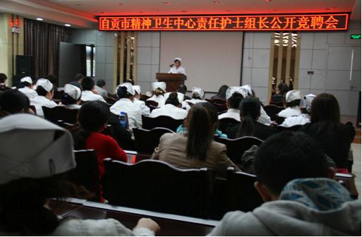 10月24日下午,自贡市精神卫生中心多功能厅举行了责任护士组长公开竞聘会,由护理部牵头,人事科、财务科等职能科室协助,院长谭友果等院领导亲自担任评委,12位评委本着公开、公平及公正原则,为30名符合竞聘条件的护士进行了现场评分。