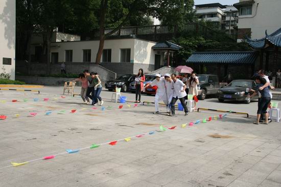 与传统的运动会不同,趣味运动会将竞技与娱乐相结合,着重于队员之间的合作。在紧张激烈的比赛中,来自临床、医技、行管后勤的23支代表队团结协作,奋勇争先,队友们在一边呐喊助威。赛场上洋溢着热情、友好的气氛。