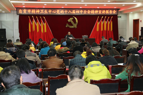 12月18日,市人大常委会顾问邱德峰莅临自贡市精神卫生中心宣讲党的十八届四中全会精神。医院全体党员和护士长以上的干部聆听了宣讲报告。