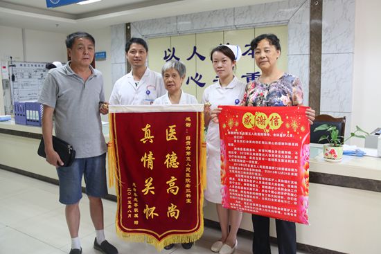 8月26日,家住光大街的张氏兄妹将写有“医德高尚,真情关怀”的锦旗和感谢信送到自贡市精神卫生中心,向精心治疗和悉心照顾他们母亲的老年三病区全体医护人员表示感谢。握着老三病区郭洛宁主任的手,张先生感激地说:“谢谢你们,要不是你们精心的照顾,我母亲不可能恢复得这么好!”