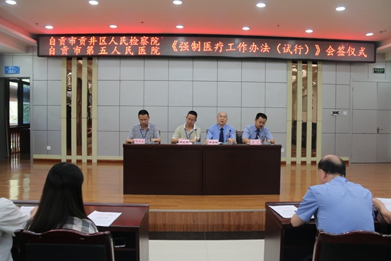 6月8日,自贡市贡井区人民检察院、自贡市第五人民医院在医院三楼多功能厅举行《强制医疗工作办法(试行)》会签仪式暨第一次联席会议。贡井区人民检察院检察长李言福与市第五人民医院院长谭友果签订了《强制医疗工作办法(试行)》,会议由医院副院长刘成文主持,贡井区人民检察院、医院相关工作人员参加。