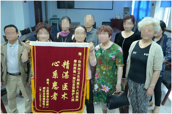 8日上午,一群叔叔阿姨来到市卫计委宣传科,拉着宣传科长曾晓玲的手不放,“姑娘啊,我们都是在五医院(市精神卫生中心)心身疾病一病区治疗的抑郁症病人,我们经过医生治疗和护士的精心照顾,现在都基本过上了正常人的生活。想当初,我们是天天都想着怎样自杀啊!”“我们今天来,就是想见见领导,当面把锦旗送给他,感谢卫计委的精心领导,感谢五医院的精心治疗!”