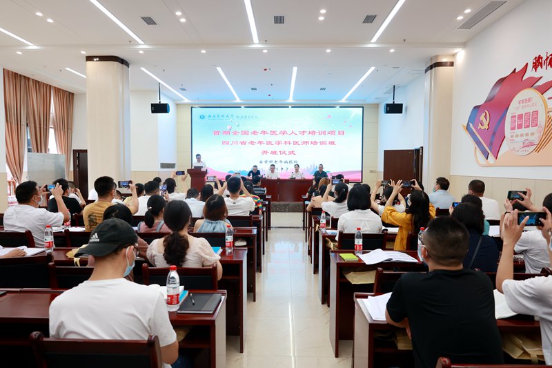 四川省卫生健康委员会老龄健康处处长韩梅、三级主任科员谢伟,自贡市卫生健康委副主任黄康,医院领导班子成员、相关职能科室负责人和来自全省21个市州70名学员参加开班仪式。