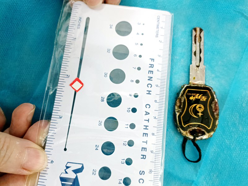 “取出来了,一切顺利!”近日,我院成功为一名患者从胃内取出一把长约8厘米,宽约4厘米防盗门钥匙。